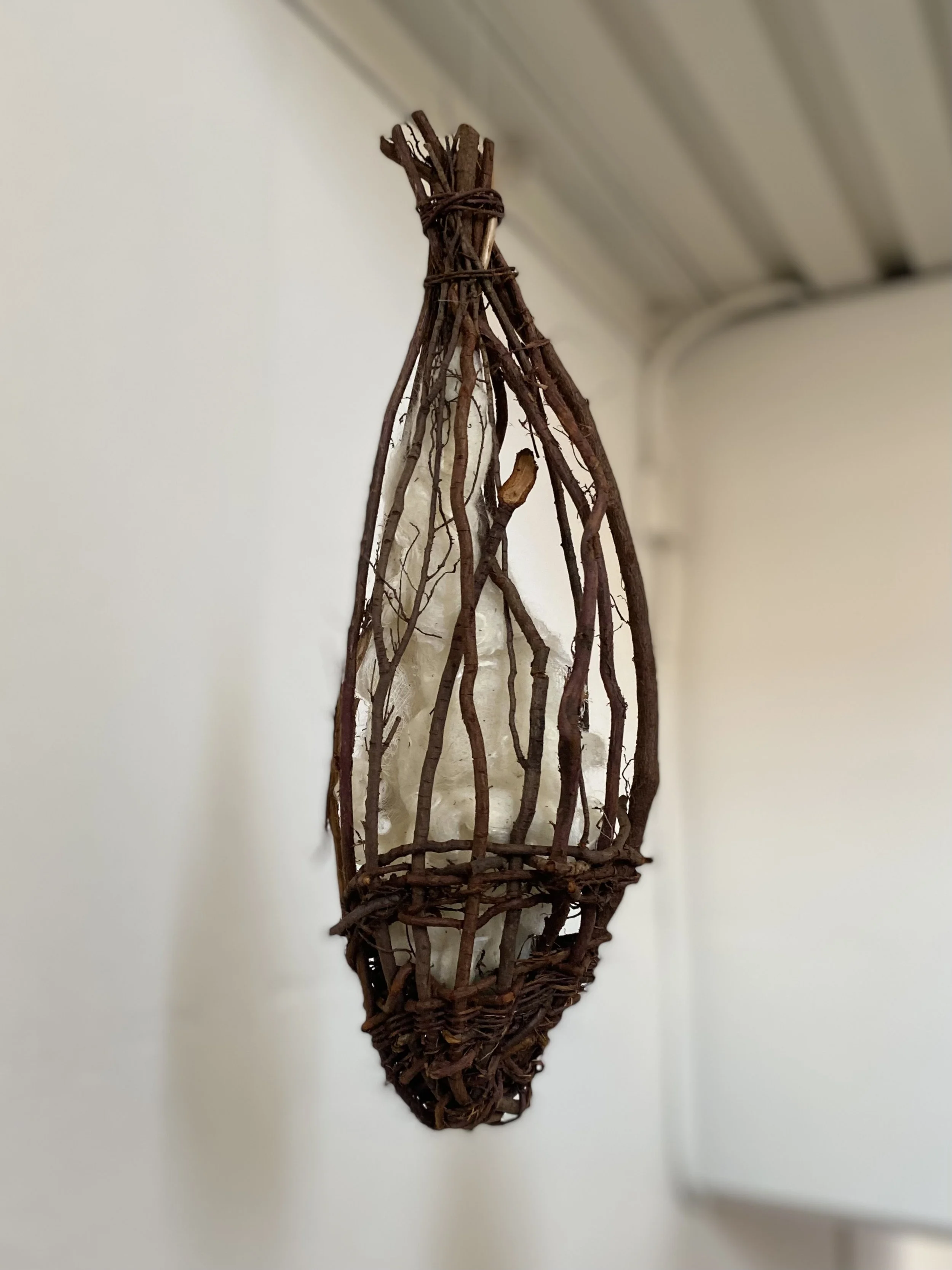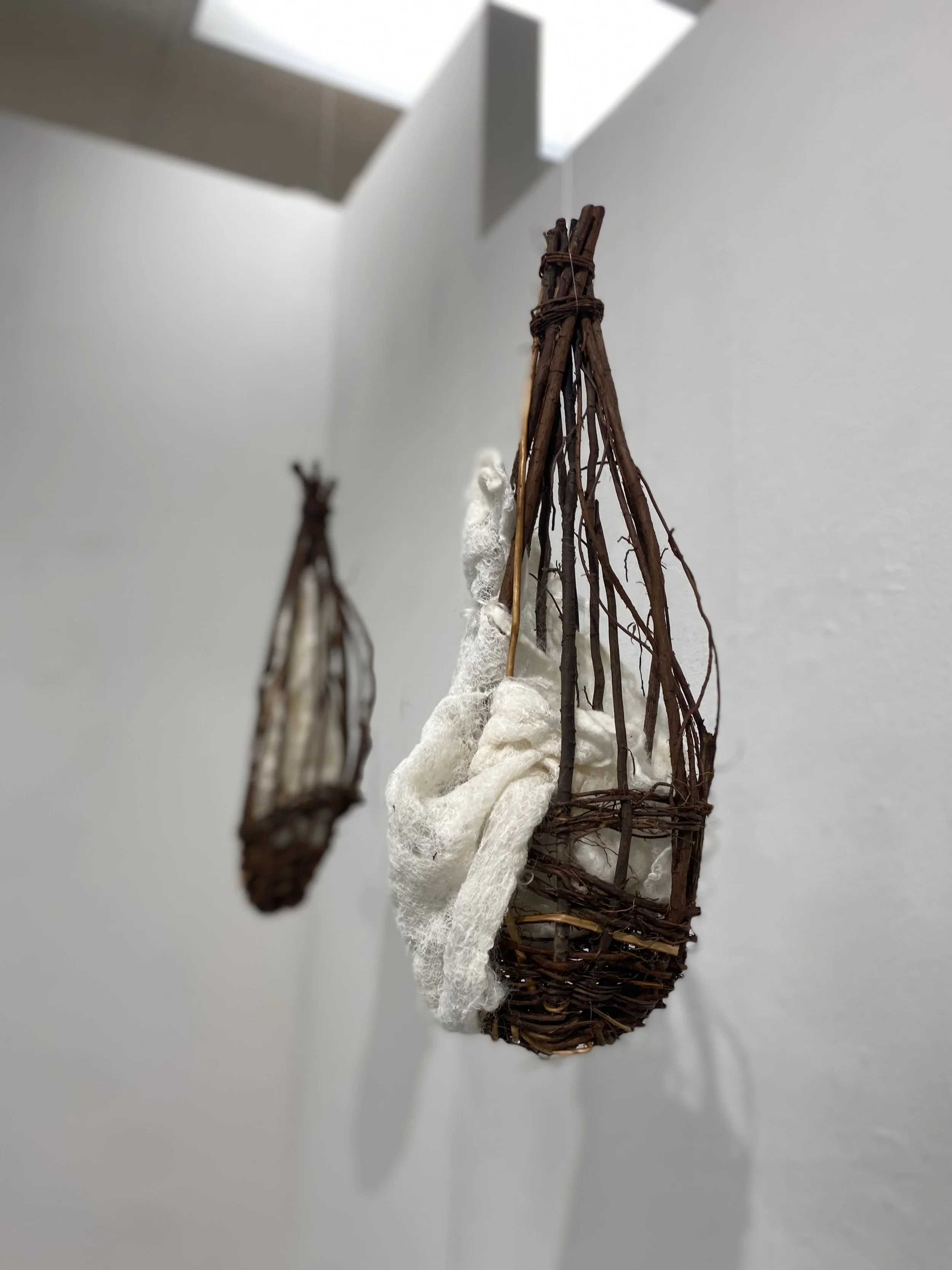 Emergence / Retraction is a series of three chrysalises woven with hemlock root that examines the non-linear nature of healing. In the context of this project, the chrysalis is a physical embodiment of suffering. The white fabric is a symbol of an entity that interacts with the chrysalis. From the front of the installation, the white fabric entity emerges from the chrysalis. However, from the back view of the installation, the white fabric entity is retracting back into the interior of the chrysalis. Healing is never linear, and sometimes suffering feels safer than fighting to escape negative patterns, thoughts, and feelings. Although, that is often a part of healing that goes unseen, hence the retraction side of the installation facing the wall.