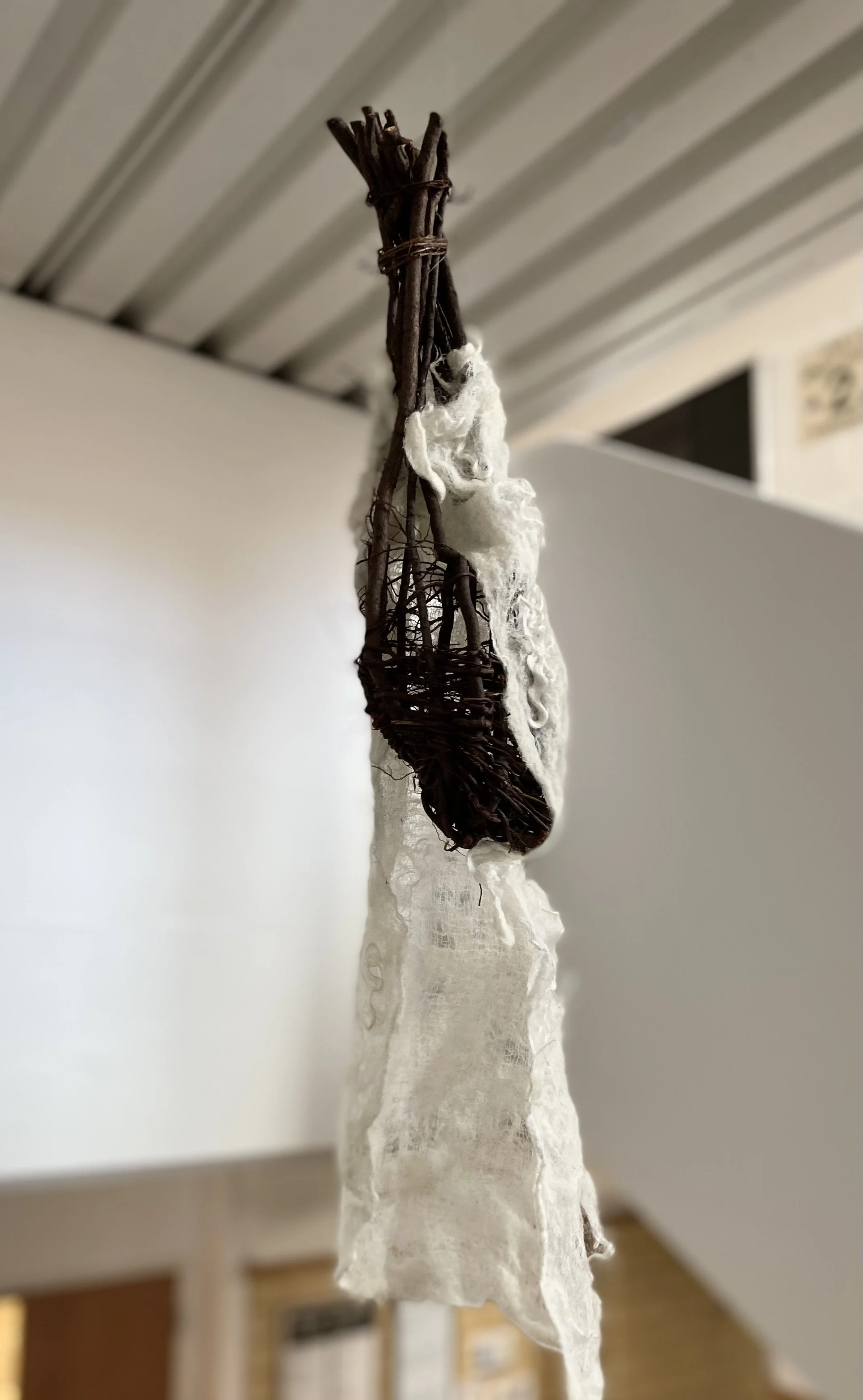 The work Emergence / Retraction began by a river with an abundance of hemlock tree roots exposed by the erosion of loamy soil. Those roots were harvested, soil and clay were rinsed off, and they were soaked in a mixture of boiling water and soda ash. The process of weaving these roots was tedious as they tended to have a mind of their own, and the more I worked with them, the more I had to allow the roots to bend and twist in all the directions they desired. The three white fiber pieces were created through a process called nuno felting. This technique combines fabrics such as cotton or silk gauze with wool by using water, pressure, and heat.