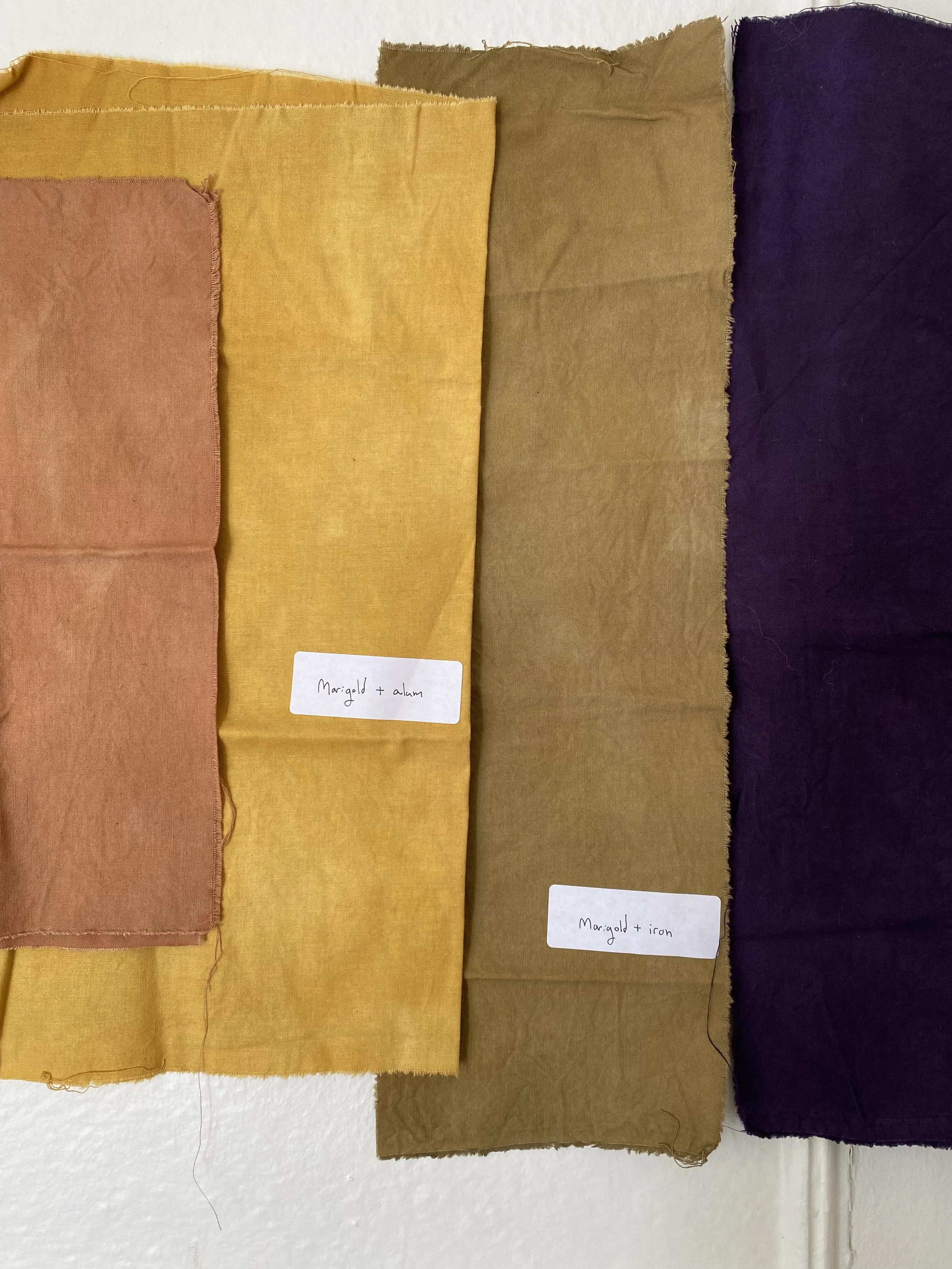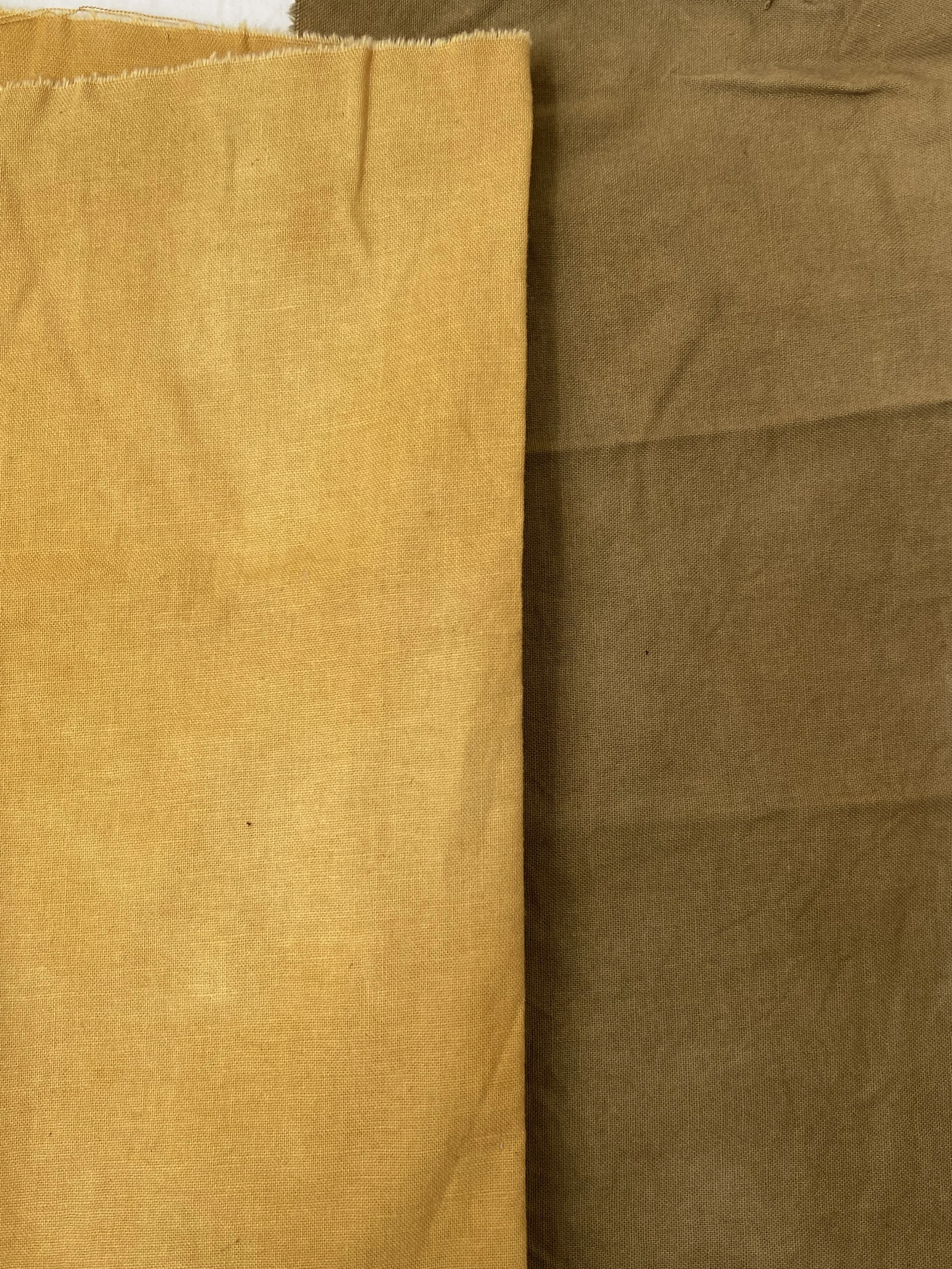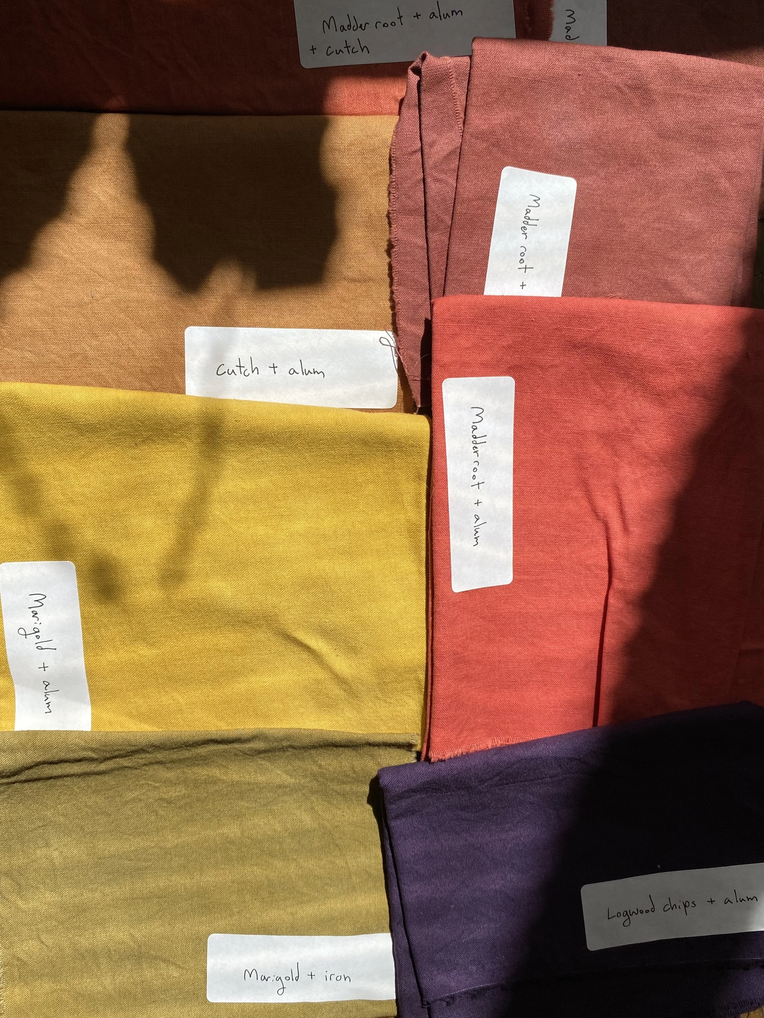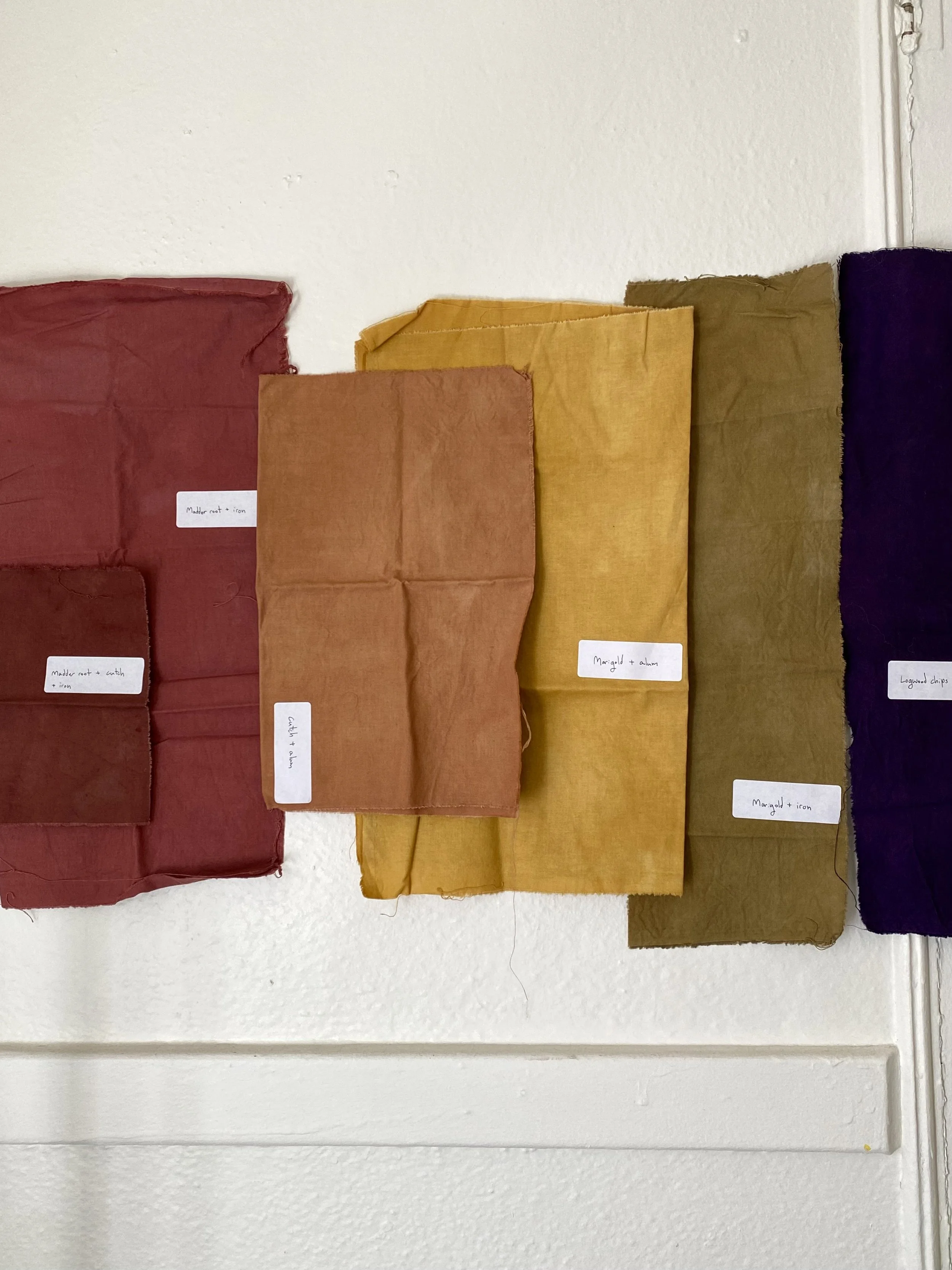 Fabric scraps dyed naturally with marigold, madder root, cutch, and logwood with some modified using an iron bath to shift the color.
