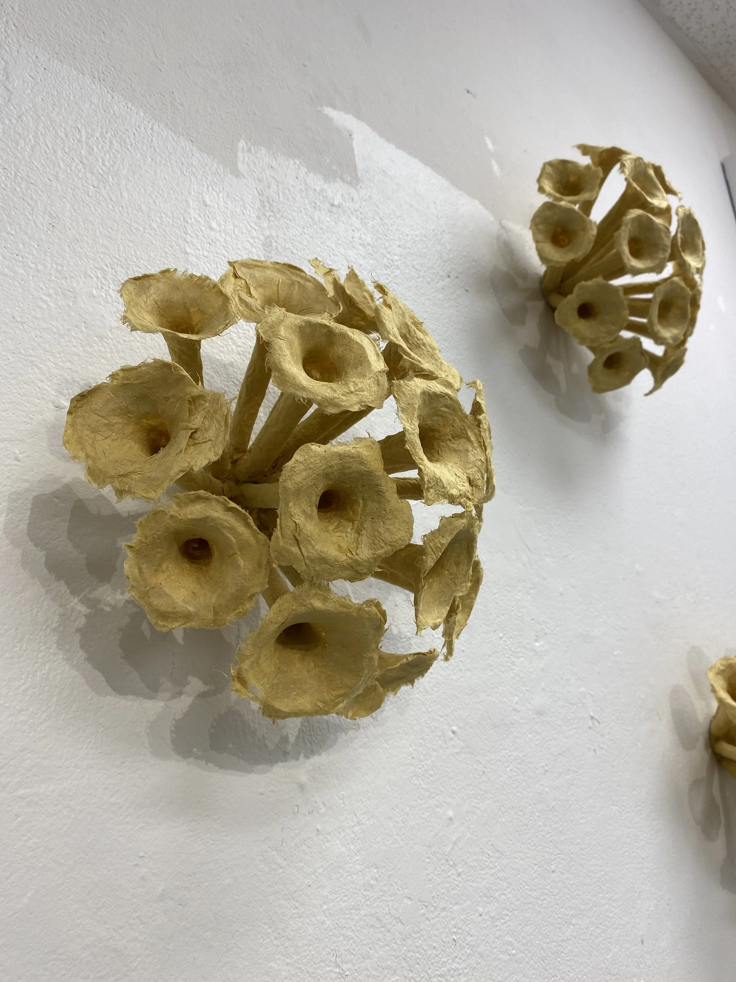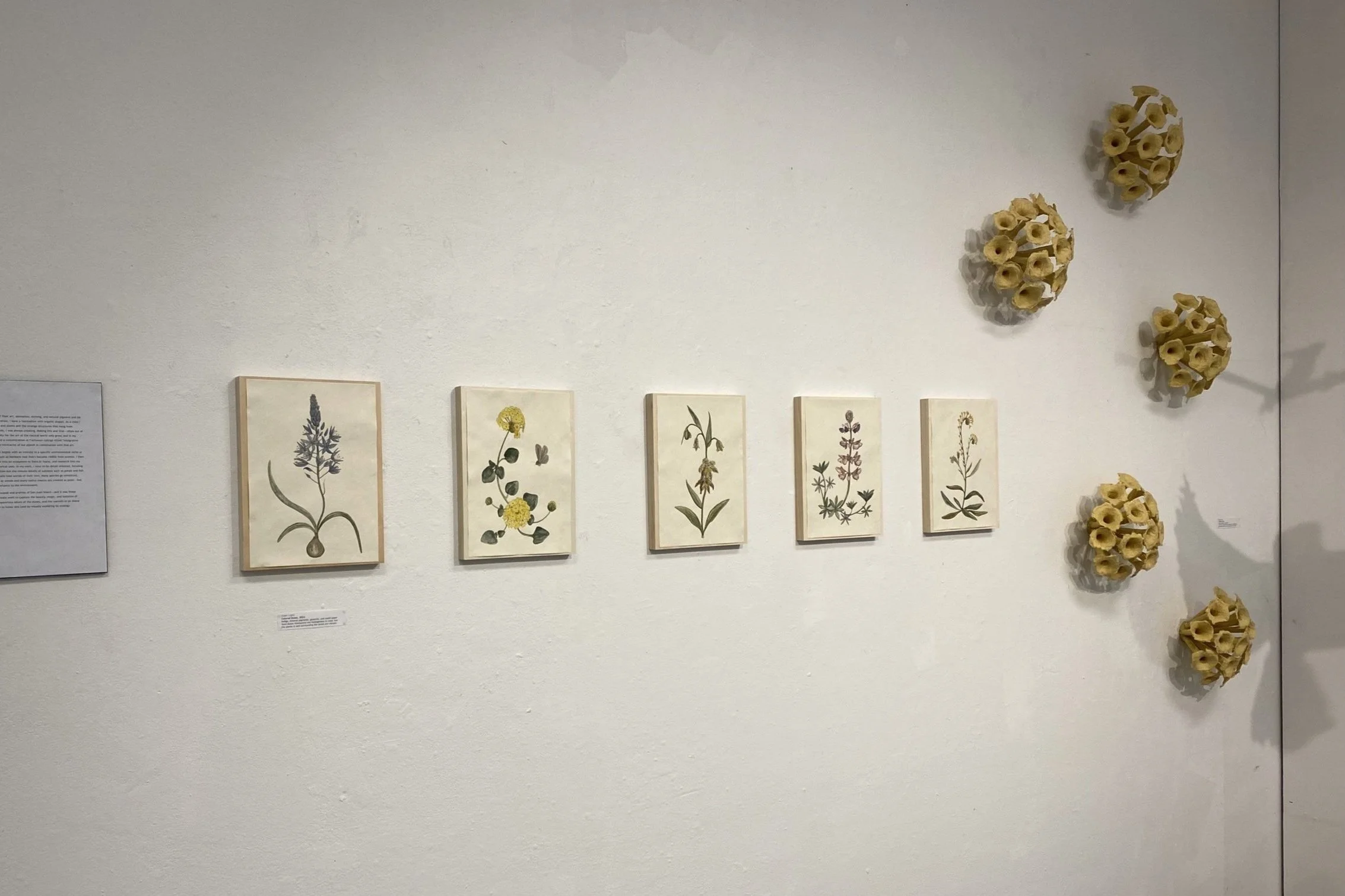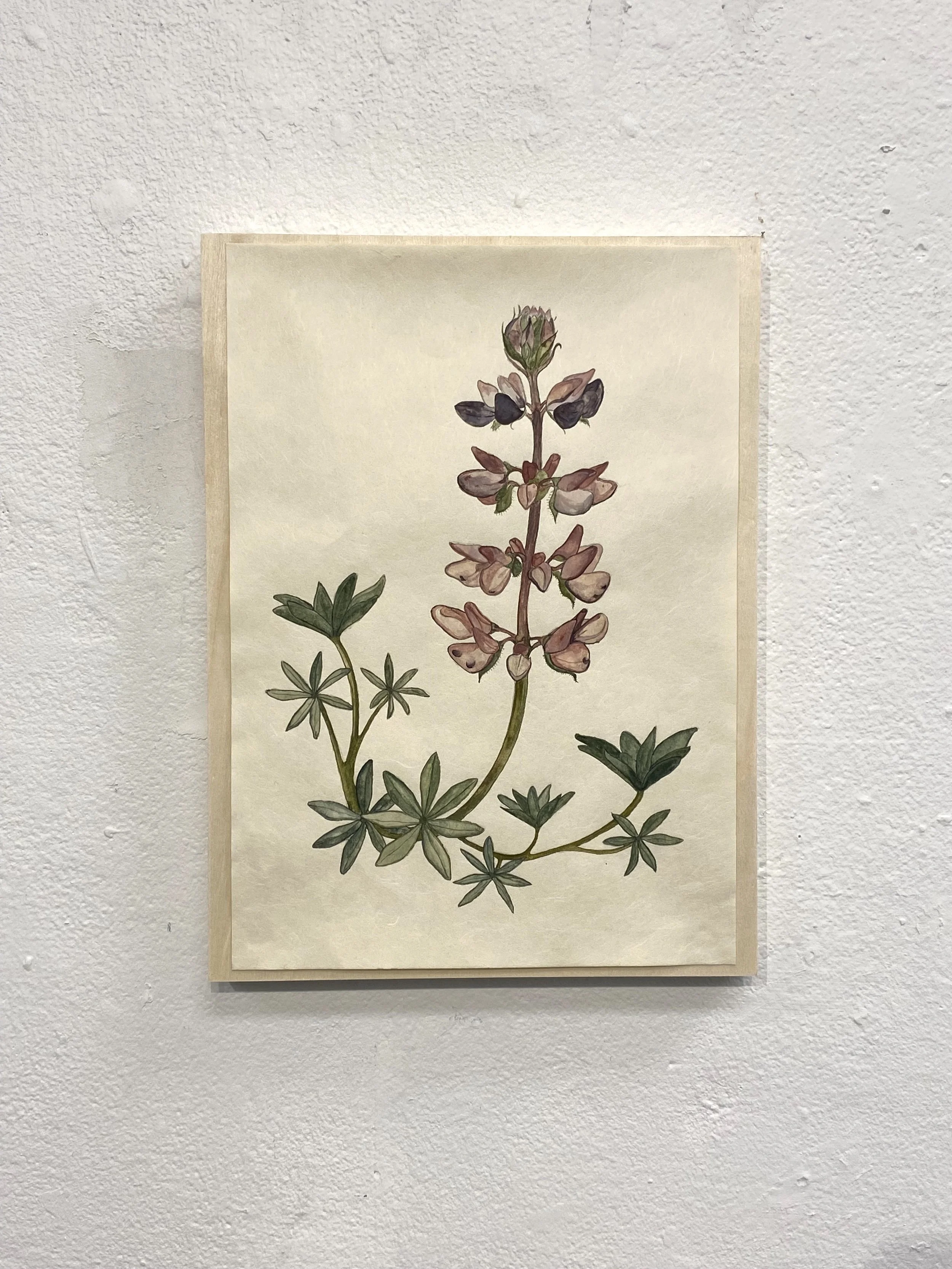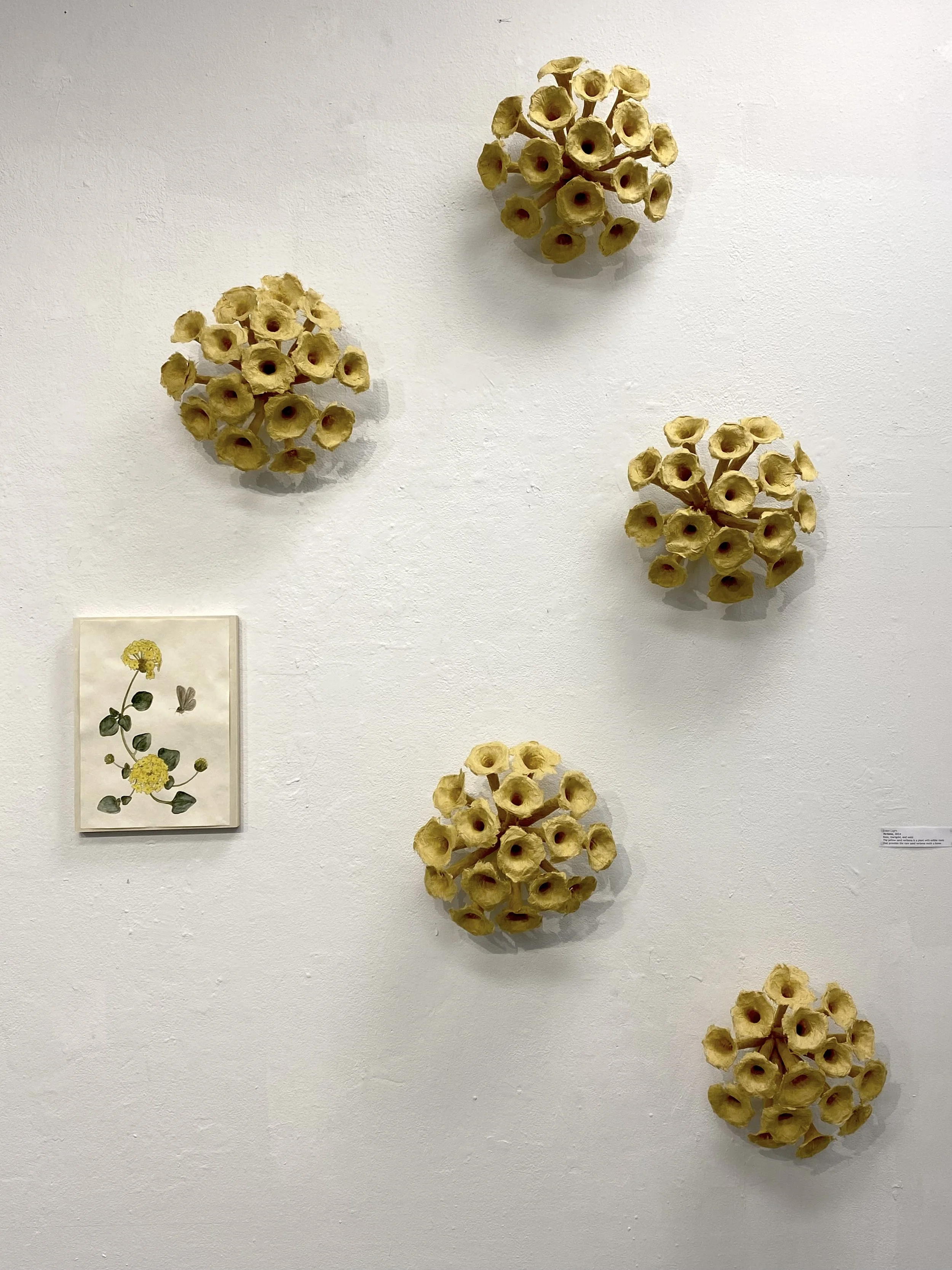 The paper used for the large flowers is kozo which I processed from the inner bark of a mulberry tree to pulp and dyed with marigold and weld. The painted flowers use natural pigments and aim to show the diversity of flora that live in both dunes and prairies on San Juan Island.