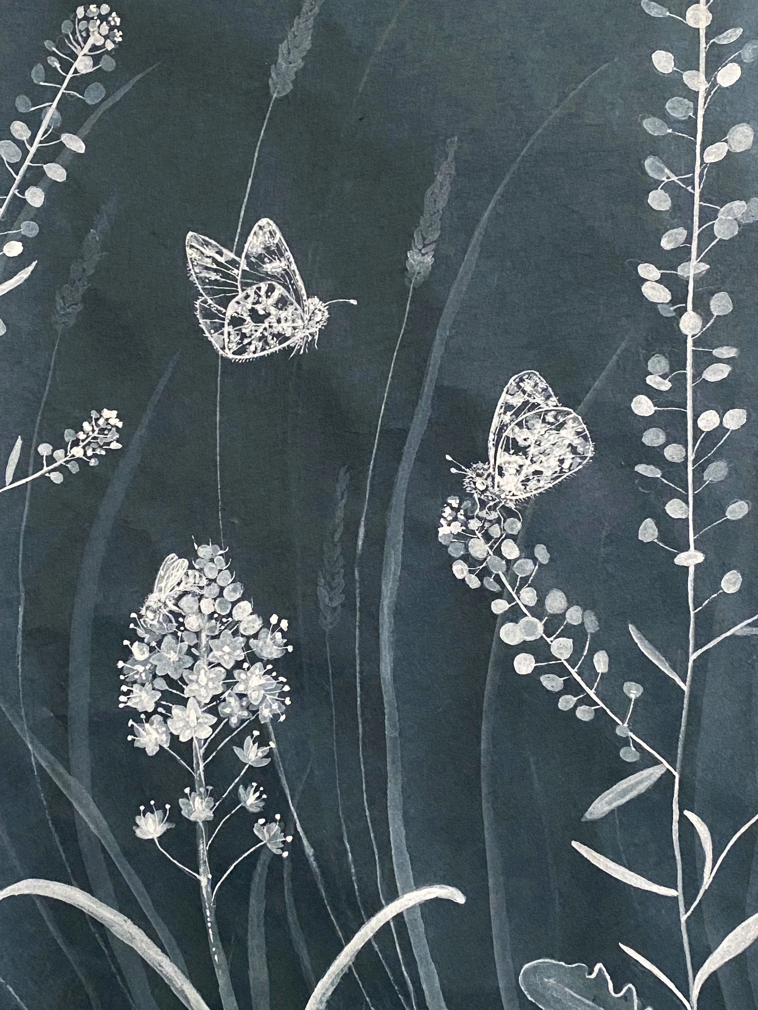 Prairie / Dune explores often overlooked plants by transforming them into mystical versions of themselves. I aim to honor the white-flowered plants that reside amongst the sand and grasses on San Juan Island by painting them in a glowing twilight on dark blue paper. This work uncovers a microcosm of organisms within a tiny and unique ecosystem. My plant and insect subjects are critical to this environment. Virginia pepperweed is the only native plant the island marble butterfly lays its eggs on, and death camas miner bees are the only pollinators that can withstand the toxin of meadow death camas pollen.