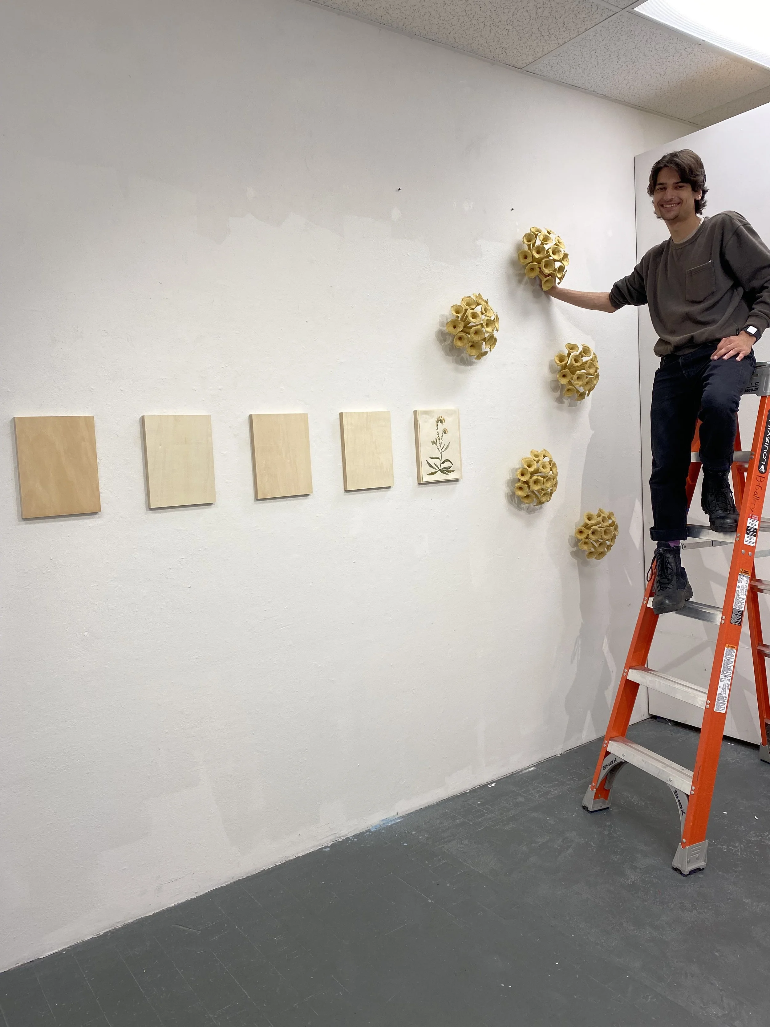 The process of creating this work began with an interest in the dunes on SJI. I began my dune explorations by creating work of dune plants with vibrant colors, but then soon realized that I was ignoring the white-flowered inhabitants. So, I went deep into research and found a plethora of information regarding the complexities of insect interactions with these specific plants. After sketching out a composition for this work, I transferred my line work onto the blue kozo paper. I then painted all of the subjects with a calcium carbonate pigment bound with hide glue for layering and a soft white effect.